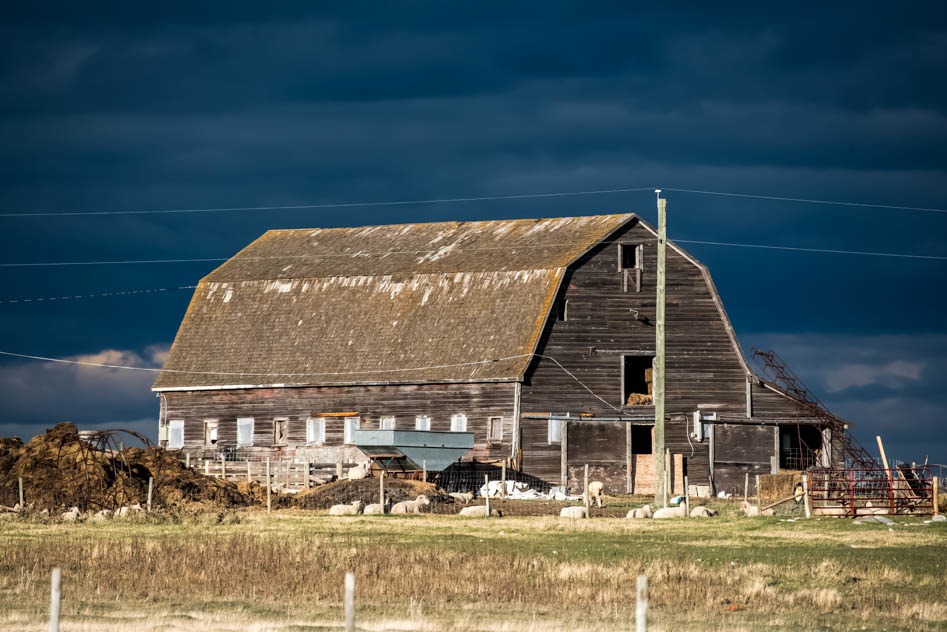 Dark skies and a sunlit old Barn, still in use along the Manitoba Prairies