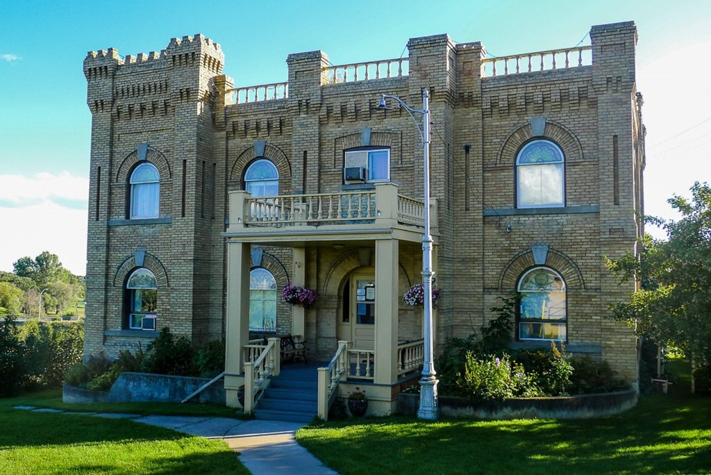 From the summer of 2012 to 2015 I had the pleasure of living in Souris, Manitoba, just 4 houses down the street from this former home, which was built by Fred Sowden, the son of Squire Sowden, who was the founding father of the Town of Souris and the Swinging Bridge that it is so well known for. The house is now a museum, but the story told says that Fred built this house for his new bride, who missed her home in England. So Fred built this in the style of an English Castle so that she wouldn’t be so homesick. I am not sure if this is folklore or actual truth, but it is a beautifully built house that has been well looked after. I have been inside the museum as well and have many photos of the original woodwork and designs for this home.