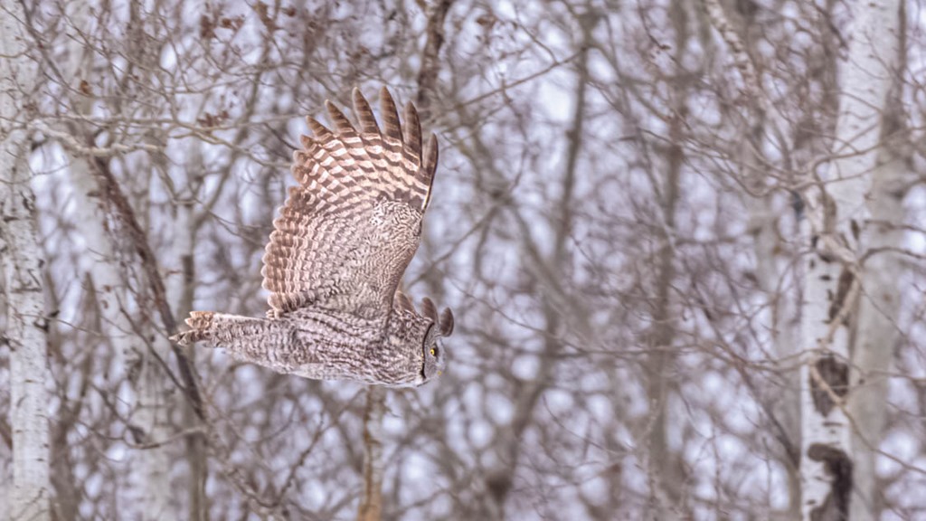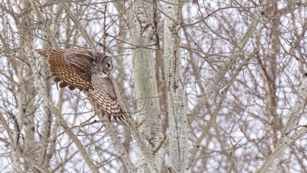 Great Gray Owl in flight moving from one tree to another to hunt for voles