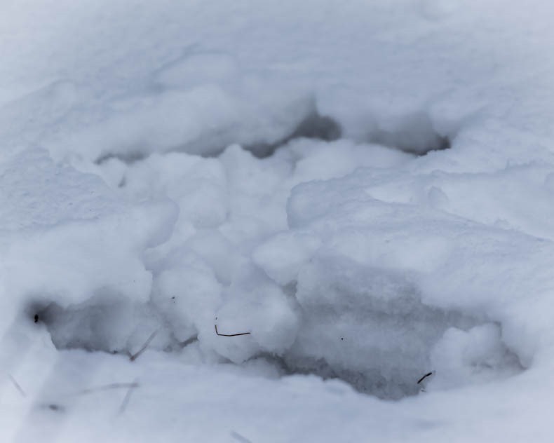 Telltale signs, otherwise known as Plung Marks of a Great Gray Owl (Strix nebulosa).