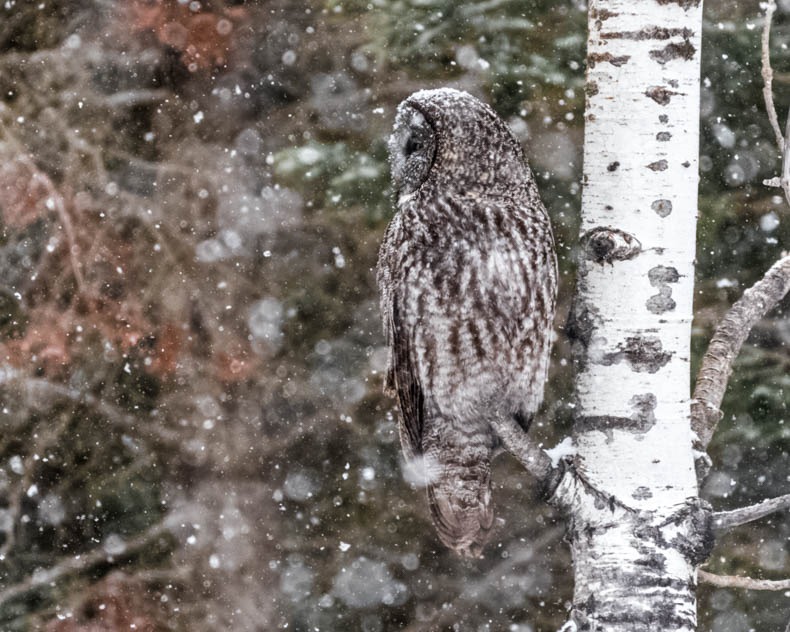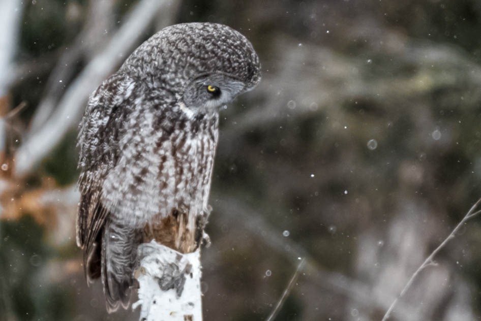 Great Gray Owls listening for voles during a winter snowfall